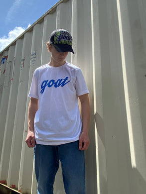 Goat Street Goods White & Blue Script Series “goat” Short Sleeve Tee